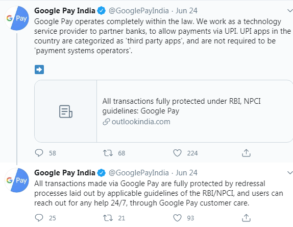 - गूगल पे इंडिया ने 24 जून को जारी एक बयान में कहा कि कंपनी पूरी तरह कानून के दायरे में काम कर रही है। हम बैंकों के साथ टेक्नोलॉजी प्रोवाइडर के रूप में काम करते हैं। देश में यूपीआई एप्स को थर्ड पार्टी एप की कैटेगरी में रखा जाता है। यूपीआई एप को पेमेंट सिस्टम ऑपरेटर होने की जरूरत नहीं होती।