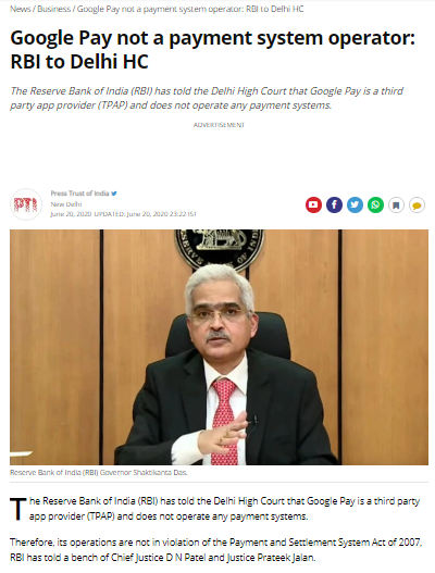 - खबर के अनुसार : आरबीआई ने एक मामले की सुनवाई के दौरान दिल्ली हाई कोर्ट में कहा कि गूगल पे कोई पेमेंट सिस्टम ऑपरेट नहीं करता। ये एक थर्ड पार्टी पेमेंट एप है। यही वजह है कि गूगल पे का नाम नेशनल पेमेंट्स कॉरपोरेशन ऑफ इंडिया (NPCI) द्वारा प्रकाशित अधिकृत भुगतान प्रणाली ऑपरेटरों की सूची में नहीं है।