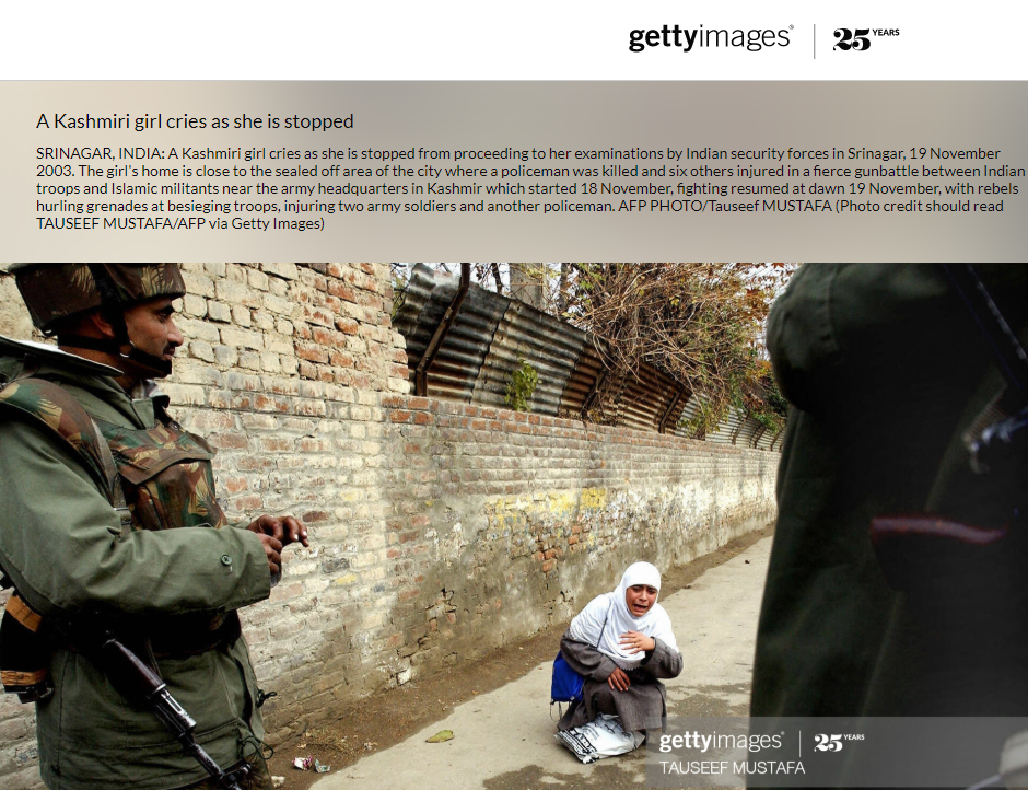 - Getty Images वेबसाइट पर फोटो से जुड़ी घटना का पूरा विवरण दिया हुआ है। वेबसाइट पर दी गई जानकारी के अनुसार : 18 नवंबर, 2003 को श्रीनगर में आर्मी हैडक्वार्टर के पास सेना और इस्लामिक मिलिटेंट्स के बीच झड़प हुई थी। 19 नवंबर को कुछ तत्वों ने इलाके में ग्रेनेड बिछा दिए, जिससे दो सैनिक और एक पुलिसकर्मी घायल भी हो गए। इस घटना के बाद सेना ने इलाके को सुरक्षा के मद्देनजर सील कर दिया। फोटो में दिख रही लड़की का घर सील किए गए इलाके में ही था। फोटो 19 नवंबर, 2003 की है। सेना के जवानों द्वारा परीक्षा देने जाने से रोकने पर यह कश्मीरी लड़की दुखी है। इस घटना को कैमरे में कैद किया है फोटोग्राफर तौसीफ मुस्तफ़ा ने।