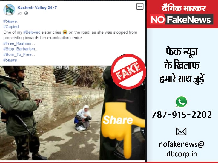क्या वायरल : सोशल मीडिया पर एक फोटो शेयर की जा रही है। इसमें सड़क पर बस्ता और किताब लेकर बैठी रोती हुई लड़की दिख रही है। लड़की के सामने सेना के जवान खड़े हुए हैं। फोटो के आधार पर दावा किया जा रहा है कि सेना कश्मीर में इस लड़की को परीक्षा देने जाने से रोक रही है।