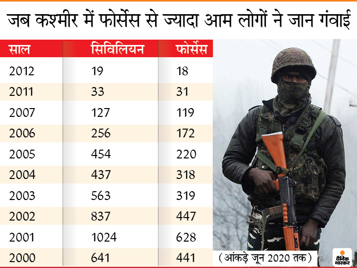 आतंकवाद जब चरम पर था उस दौरान साल 2000 से लेकर 2007 तक लगातार एनकाउंटर और गोलीबारी में मरनेवालों में सिविलियंस की संख्या सेना और सुरक्षाबल से भी ज्यादा थी। हालांकि, 2007-2011 तक सिविलियंस की संख्या कम हो गई। लेकिन, उसके बाद अचानक दो साल तक ये लगभग बराबर रही।
