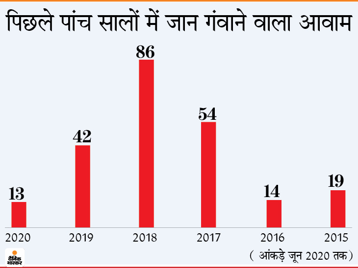 Jul 01, 2020, 09:19 PM ISTनई दिल्ली. जनवरी से लेकर जून तक 13 आम लोगों की मौत आतंकवादी ऑपरेशन के दौरान हुई है। इनमें वो लोग शामिल हैं, जो आतंकवादी एनकाउंटर के दौरान गोलीबारी के बीच में आ गए। कश्मीर में पिछले 20 सालों में ऐसे अपनी जान गंवाने वाले आम कश्मीरियों की संख्या 4 हजार से भी ज्यादा है।