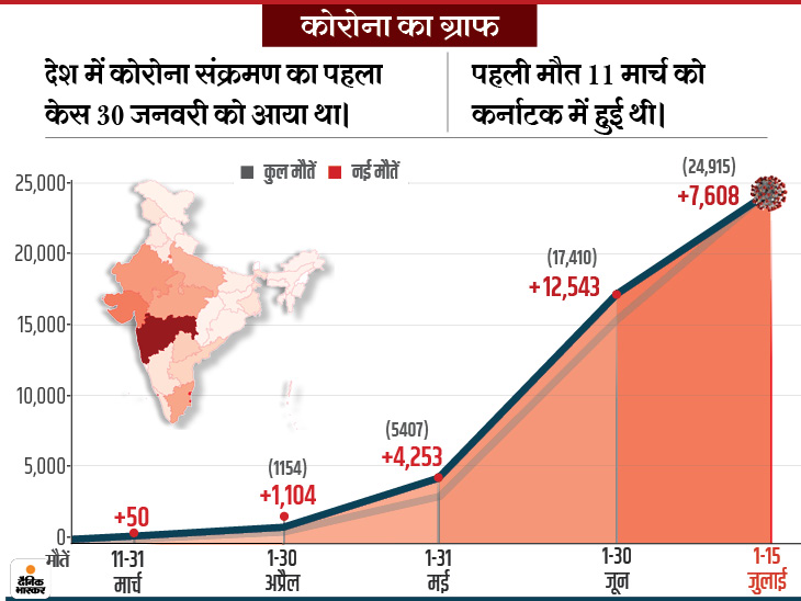 देश में कोरोना संक्रमण से मरने वालों की संख्या बुधवार को 24 हजार 915 हो गई। पिछले 24 घंटे में 600 लोगों ने दम तोड़ा। लगातार छठवें दिन 500 से ज्यादा संक्रमितों ने जान गंवा दी। सबसे ज्यादा महाराष्ट्र में 233 लोगों की संक्रमण की वजह से मौत हुई। राजधानी दिल्ली में कोरोना से 41 लोगों की जान गई।