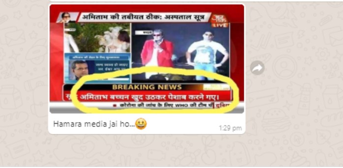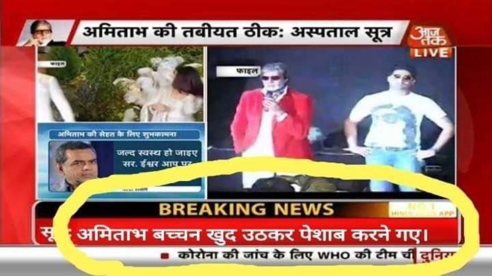 - ब्रेकिंग न्यूज सेक्शन में लिखा है : अमिताभ खुद उठकर पेशाब करने गए।