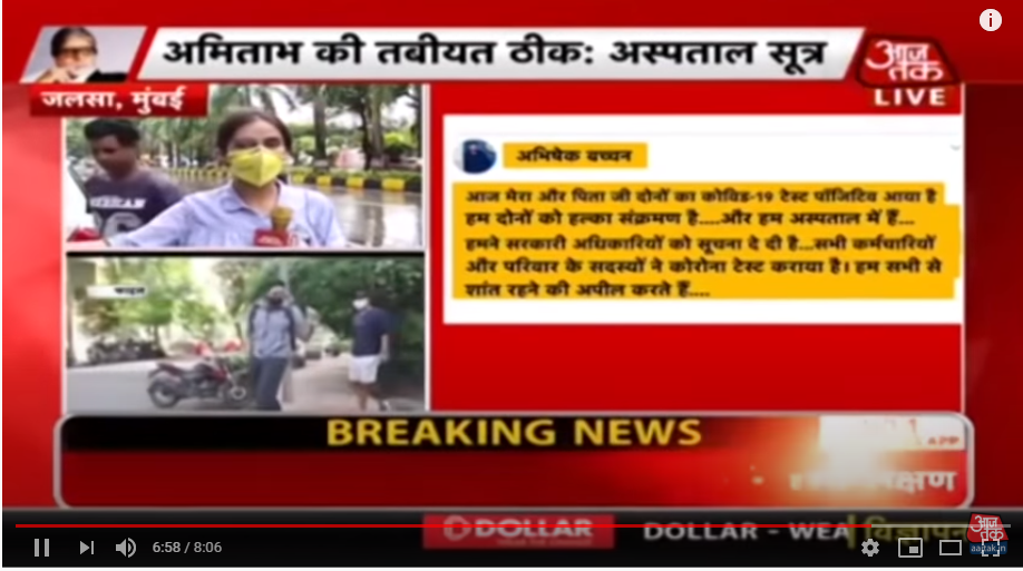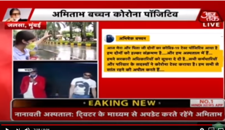 - हैडलाइन- आज तक के यूट्यूब चैनल पर हमने उस हैडलाइन वाले वीडियो तलाशने शुरू किए। जिनमें लिखा हो - अमिताभ बच्चन की तबीयत ठीक: अस्पताल सूत्र। हमें 11 जुलाई को अपलोड किया गया एक वीडियो मिला। जिसमें यही हैडलाइन है। वीडियो शुरू होने के 7:25 मिनट बाद ये हैडलाइन फ्लैश हुई। लेकिन, यहां से स्क्रीनशॉट की बाकि चार चीजें गायब हैं। परेश रावल का बयान, अमिताभ और अभिषेक बच्चन की फोटो, विवादित लाइन, डब्ल्यूएचओ वाली खबर का अपडेट।