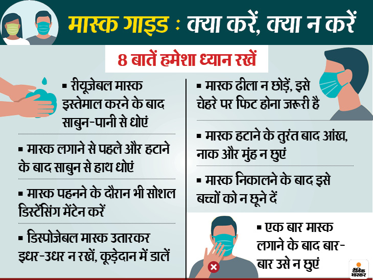 - विशेषज्ञों के मुताबिक, मास्क ऐसे लगाएं ताकि मुंह-नाक अच्छे से कवर हो जाए, इसे हटाकर गले-कान में टांगना संक्रमण की वजह बन सकता है