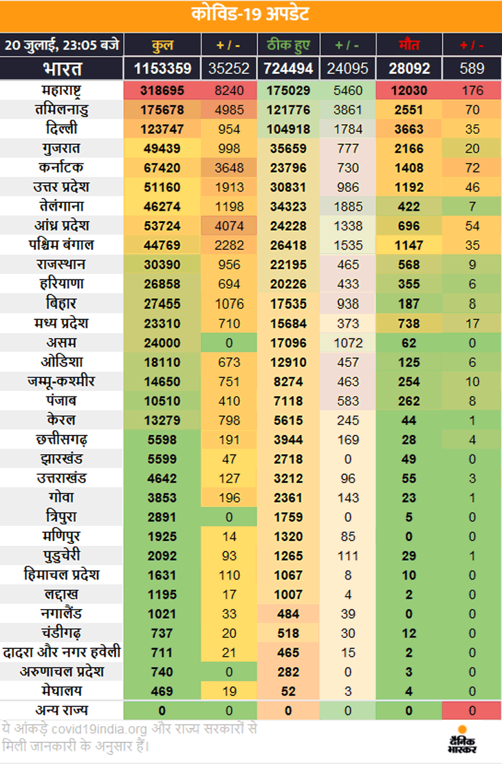 देश में कोरोना मरीजों की संख्या 11 लाख 53 हजार 824 हो चुकी है। सोमवार को लगातार तीसरे दिन 35 हजार से ज्यादा केस बढ़े। पिछले 24 घंटे में 35 हजार 717 मरीज मिले। इसके पहले रविवार को रिकॉर्ड 40 हजार 243 और 18 जुलाई को 37 हजार 407 मरीज मिले थे।