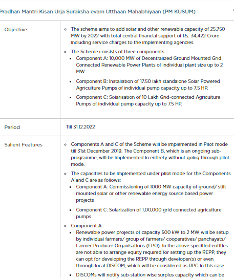 - योजना का पूरा नाम है Pradhan Mantri Kisan Urja Suraksha evam Utthaan Mahabhiyan (PM- Kusum)। इसके तहत सोलर पंप इंस्टॉल किए जाते हैं या फिर पुराने पंपों और खेती को अन्य इलेक्ट्रिक उपकरणों को सोलर एनर्जी से जोड़ा जाता है। योजना में आर्थिक सहायता के लिए हर राज्य में एक एजेंसी को अधिकृत किया गया है। आवेदक को अपने राज्य की एजेंसी से ही संपर्क करना होता है।
